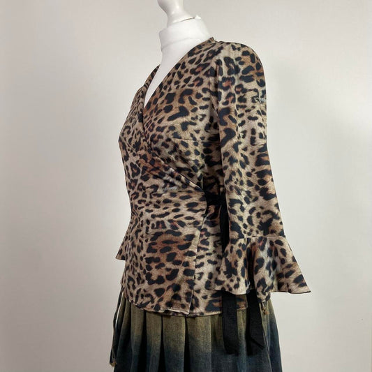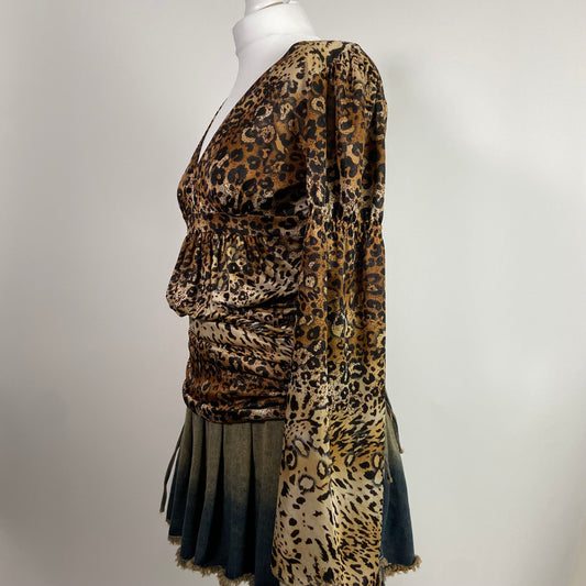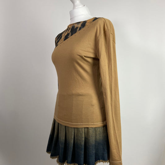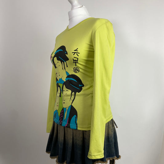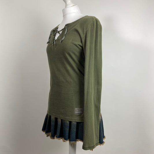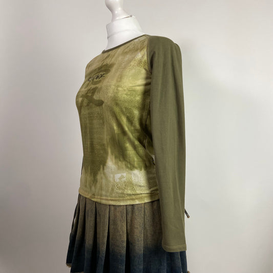 00s Khaki Graphic Print Top With Lace Up Detailing - Size M