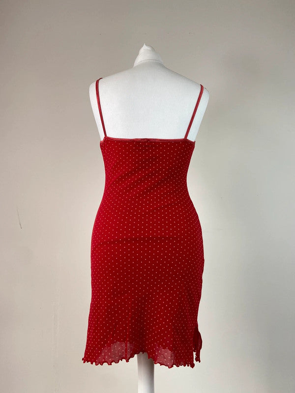 Red polka dot mesh double layered dress. Fabric has some stretch to it. Fits sizes uk 8 to 10. Model is a size 8/10 with 35” bust and 28” waist. Good condition