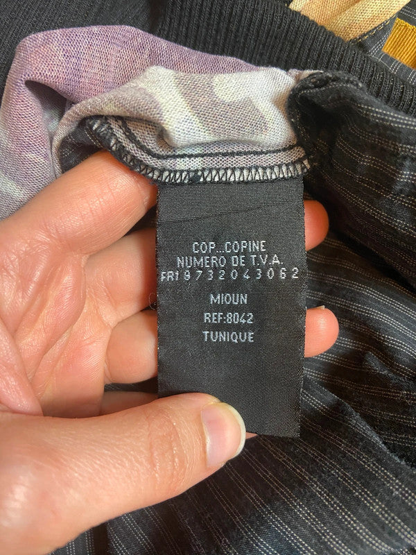 Cop Copine graphic printed long sleeve top with mesh front and pinstripe sleeves. Can be worn with an open back too. Taille 3 on tags which is a UK 12, fits sizes UK 10 to 12 so I’ve listed it as a medium.