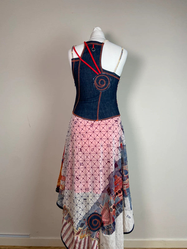 STQ funky graphic printed asymmetrical deconstructed double layered dress in denim and mesh fabric. Fits best sizes UK 8 to 10. Model is a size 8/10 with 35” bust and 28” waist. Great condition