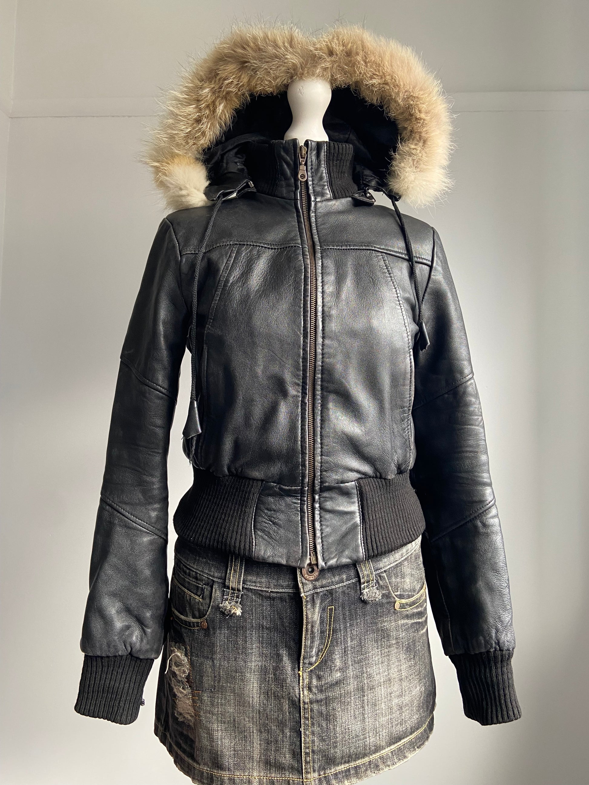 Fur hooded leather zip up jacket size S. Mannequin is a size UK 8-10.